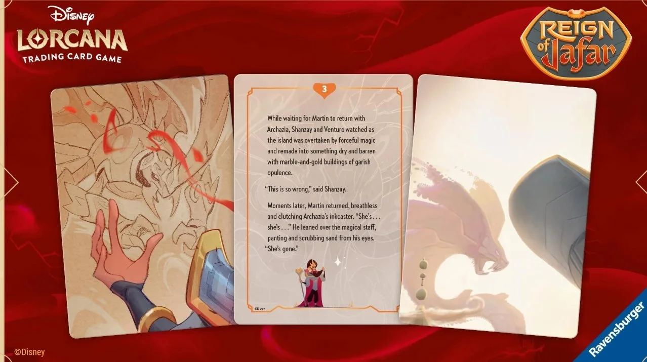 We are super excited by the return of Lore Cards. First introduced in Archazia’s Island, Ravensburger has found another way to present the story of Lorcana to the players. We assume there will once again be 20 cards to collect. 1 side will be images that when put together form two 9x9 puzzles. The other side will continue the story of our favorite Illumineers as they ready to take on Jafar. And according to the card in this marketing image, Archazia is…missing!?