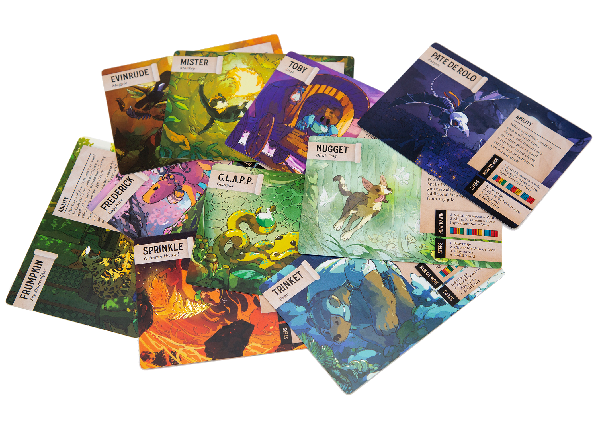 Bluffs will be called, traps will be set, and strategies will be evaded; A Familiar Find challenges players to think sharply and act fast but decisively. Featuring quick turns, easy-to-learn rules, and a deck full of surprises, every game delivers a fresh and delightfully magical experience. This lighthearted adventure will transport you into the paws, claws, wings, and abilities of a loyal animal companion racing to gather rare spell ingredients for the most powerful spellcasters in the world. Fans will be thrilled to play as iconic familiars from Critical Role Campaigns 1–3, including: Trinket the Bear, Mister, Pâté de Rolo, and more.