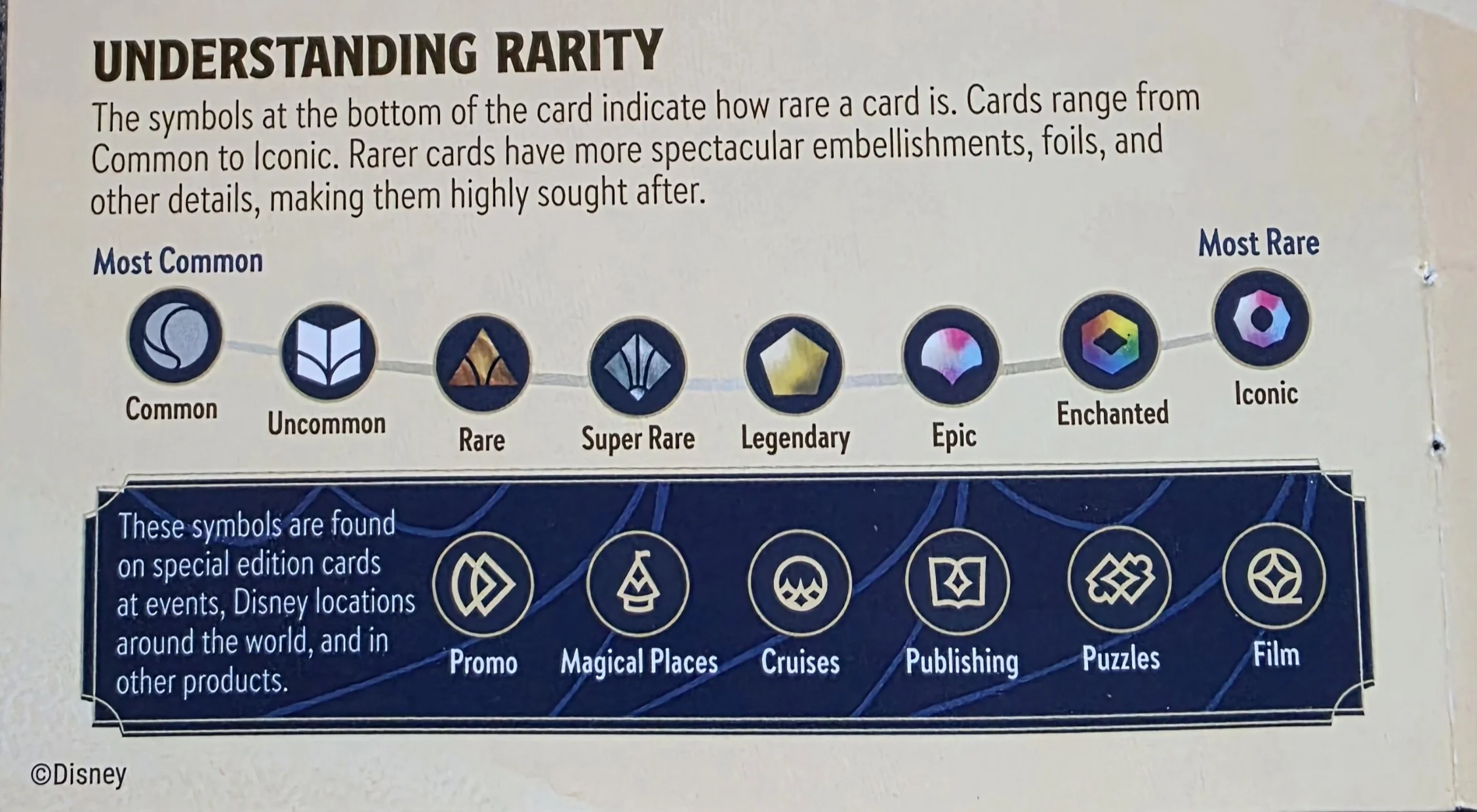 With that being said, there are two new symbols that we have yet to see. The first is the Puzzles logo. We have received Lorcana themed puzzles in the past. We have even received some that came with promos in the past. But these promos had the traditional Promo symbol on them, not the Puzzles symbol. And the last new rarity is Publishing. Only recently has Ravensburger been releasing products such as the Official Collector’s Guides. And currently it seems there will be other books published by the official Narrative Team in the future. It is very likely that some of these future products will be where we first see these new Publishing Promos.