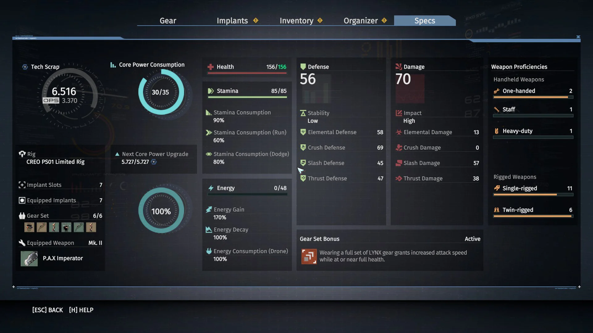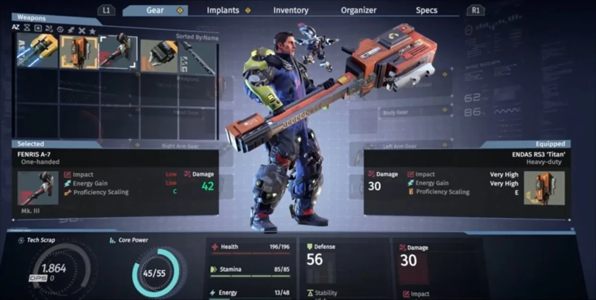 The tech scrap players collect can be used to upgrade weapons and add to armor. Players can wear armor on every part of their body. This includes head, legs, arms, torso and it doesn't have to match. Some of it adds different boosts to stats for defense and offense. Players also have access to implants which can provide healing, stamina boosts, and access to more health, as well as a few other bonuses. These implants, armor use, and weapons drain the suit’s core power. The core can be upgraded with scrap, which will let players utilize better armor, use stronger weapons and of course, have more implants.