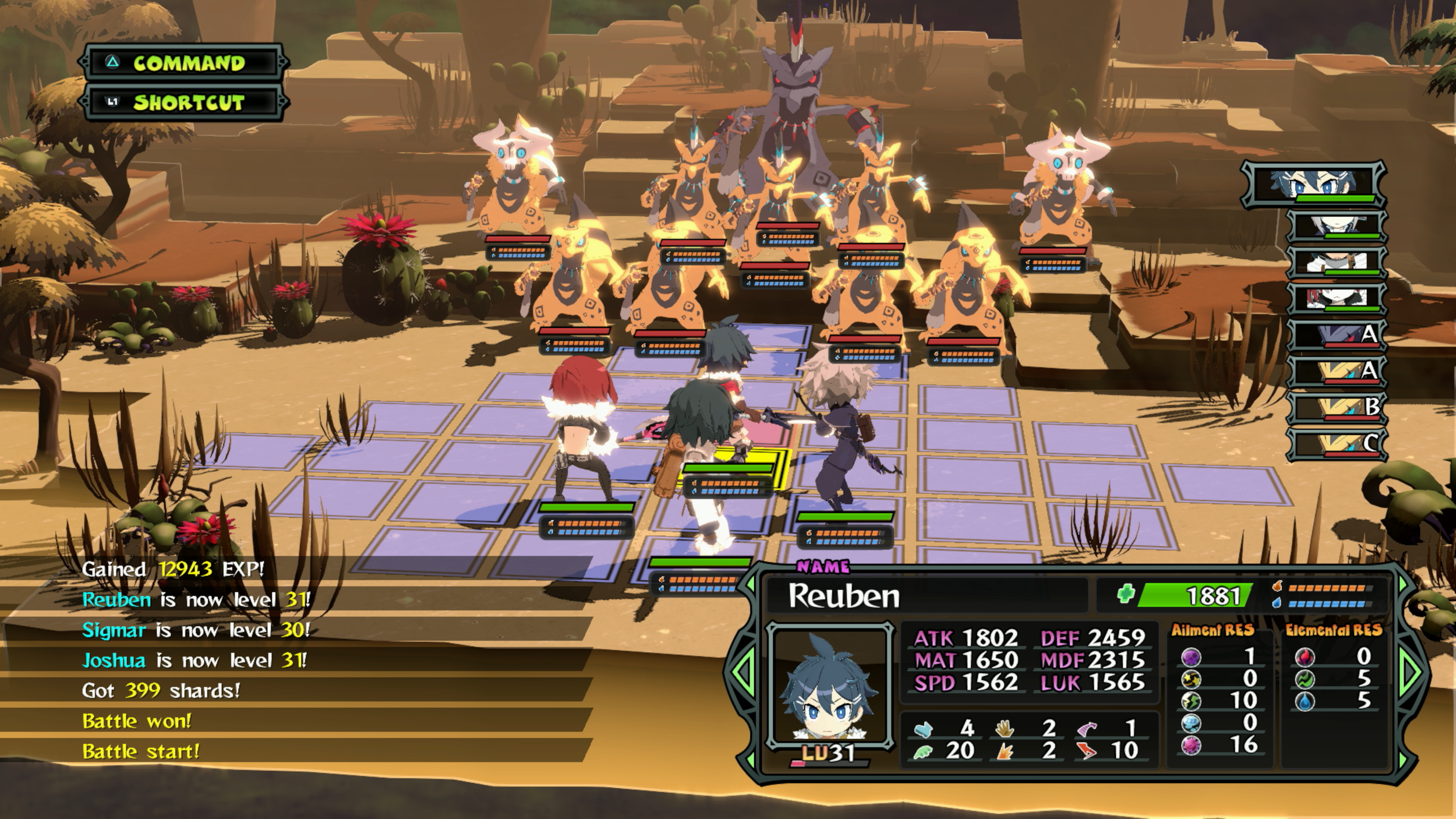 The dungeon play itself is fairly simple. Gather sparkly resource spots, kill enemies, find the door to the next level, repeat. You can sneak up on enemies for an advantage or they can ambush you when you’re facing away from them or busy collecting resources. Once in battle a grid will pop up around each character in your party showing their movable space. You cannot move your characters outside of this grid and you have to be close enough to the enemies in order to attack in a turn-based sequence.