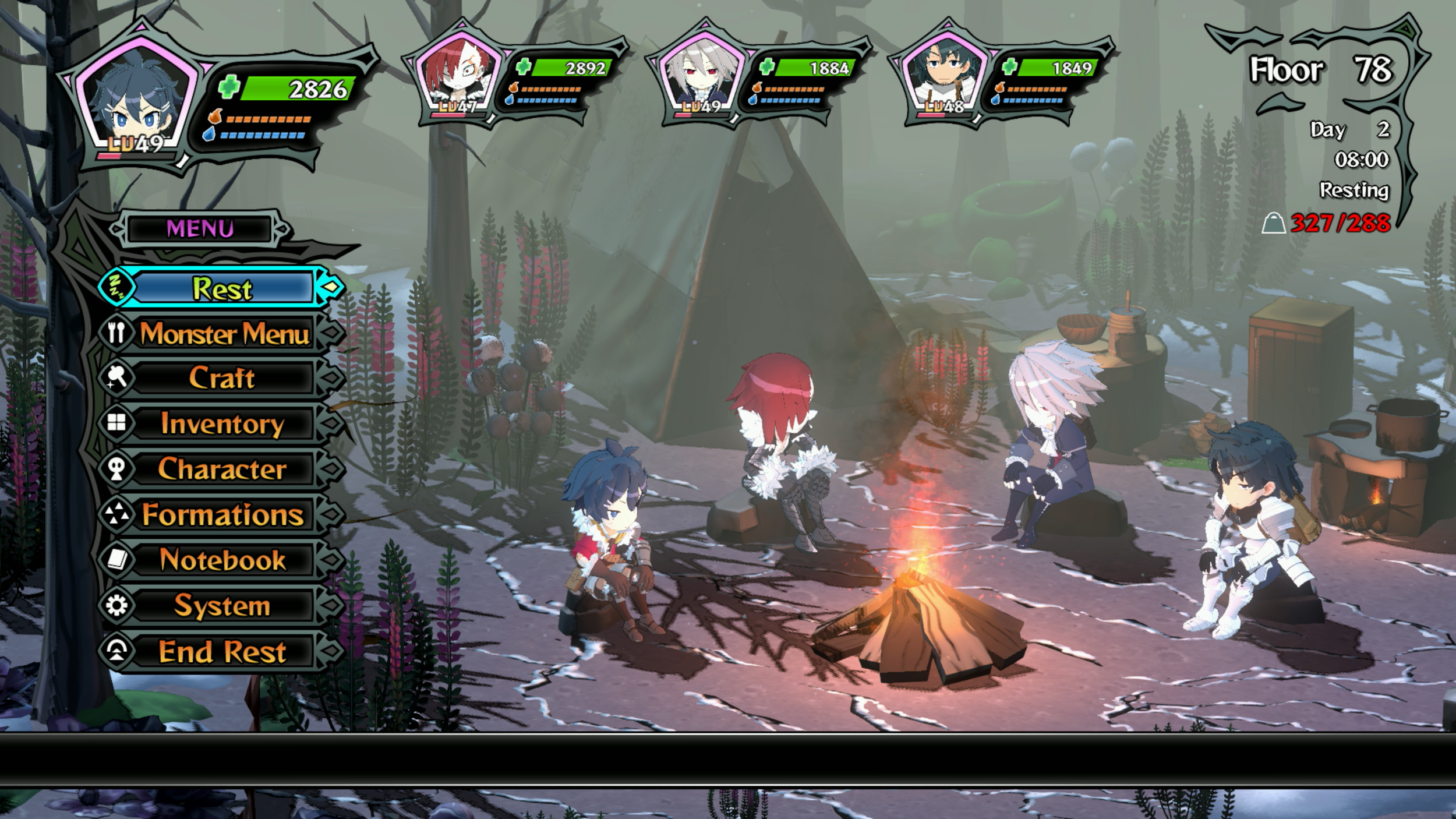 Visually the art style does a lot of the heavy lifting and NIS does a great job of carrying that style throughout the menus and other aspects of the game. The character models are high quality with crisp lines capturing their Anime art style, while the dungeon floors are a lot lower quality and resolution with their blurry and forever repeating textures. The lighting and particle effects however, especially around the campfire, were quite impressive.