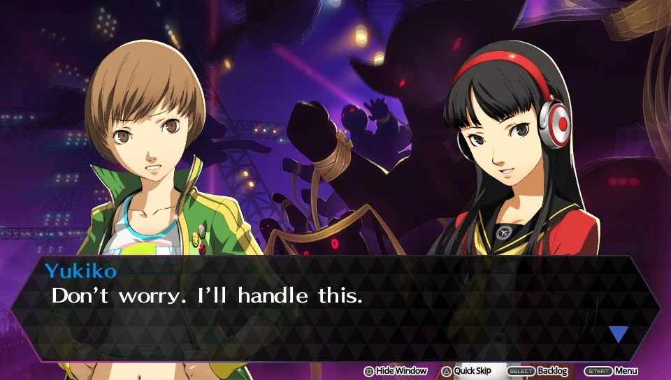 The game’s major events are all surrounding the upcoming “Love Meets Bond” music festival. The two main acts of the festival are Rise Kujikawa, a former idol making her return after she has taken a brief hiatus and the Kanamin Kitchen Girls, a very popular group of idols. Rise asks the familiar faces of Persona 4, Yu, Kanji, Teddy, Naoto, and a few more to be her back up dancers. Shortly after Rise introduces the supporting act of the Kanamin Kitchen Girls to the rest of the gang, the Kanamin Kitchen girls get sucked into a mysterious world known as the Midnight Stage. The Persona 4 team decides that they should enter the Midnight Stage world and rescue the Kanamin Kitchen Girls and thus the adventure begins.