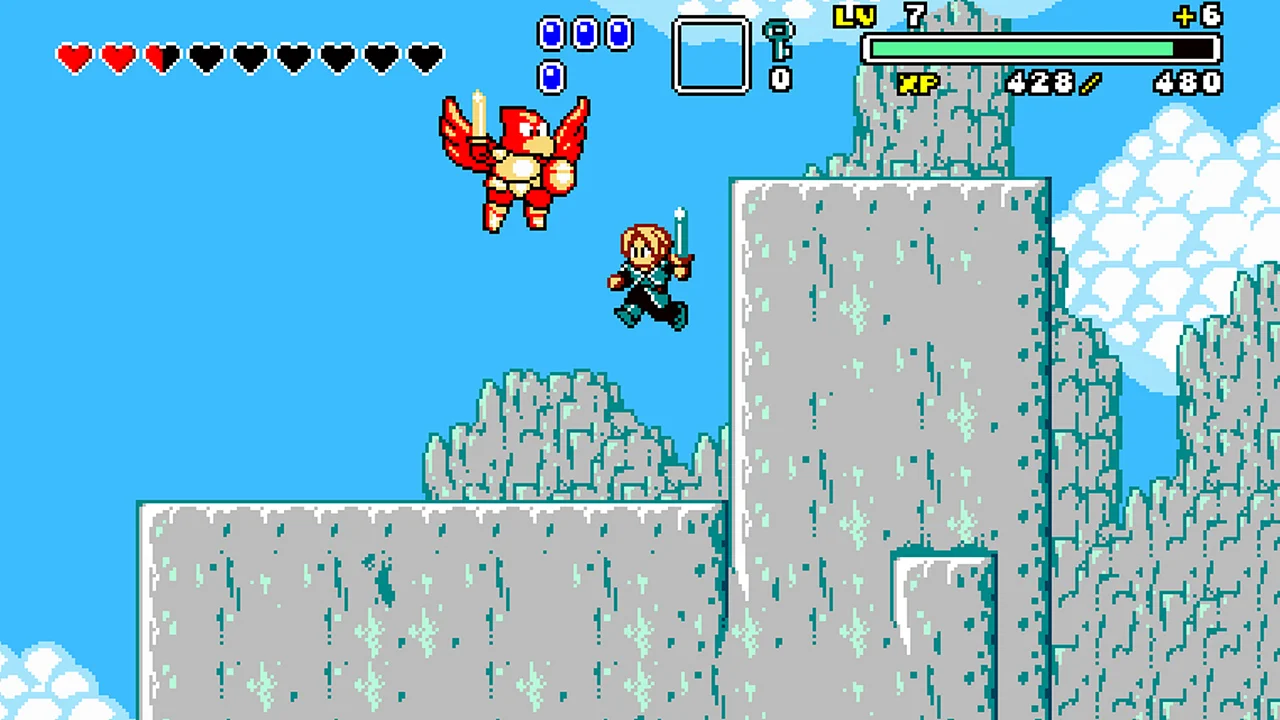 Zelda II came to mind immediately upon learning one of my first new moves, the downward thrust. After struggling repeatedly to get past basic enemies, the downward thrust let me pounce on their weak points for maximum damage. These MetroidVania boosts keep happening as you progress, making unbearable sections of the game more manageable. There were points where I could barely make a jump, requiring pixel-perfect navigation edge-to-edge with dire consequences of falling back down several levels and having to start over again. Passing the challenge would net me a new ability, such as an upward thrust that acted as a double-jump, giving me access to new areas and a better way to navigate the previously difficult sections. As you go on, you come to see areas as new challenges or hints of what is to come, such as the mysterious metal grates you eventually learn how to teleport through. The basic art style allows you to easily remember where these blockades are, and you are rewarded with bonus chests or shortcuts between areas.
