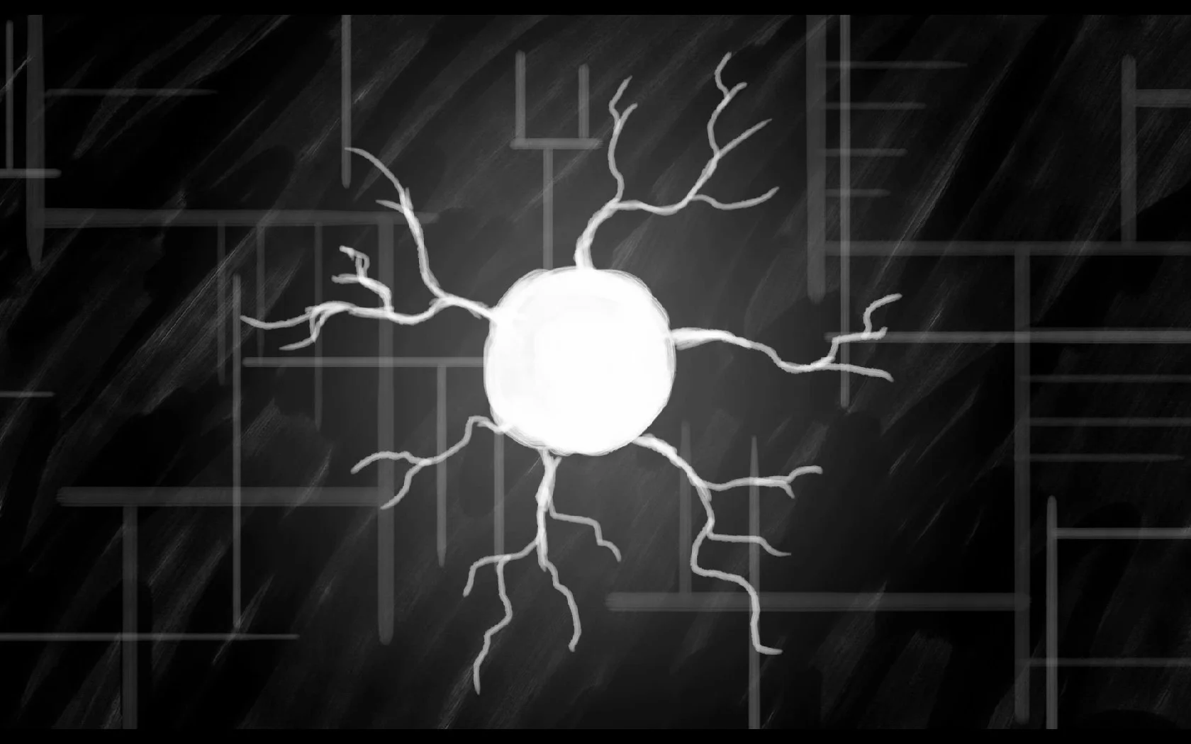 The scratchy black and white art gives it an eerie feeling, as if something's always slightly off or something is about to leap out from around the corners. Combined with the creepy ambient music, the atmosphere reminded me a little of Limbo (another black and white game filled with traps and things trying to kill you) which isn't bad company to have. Sym is, however, its own game.