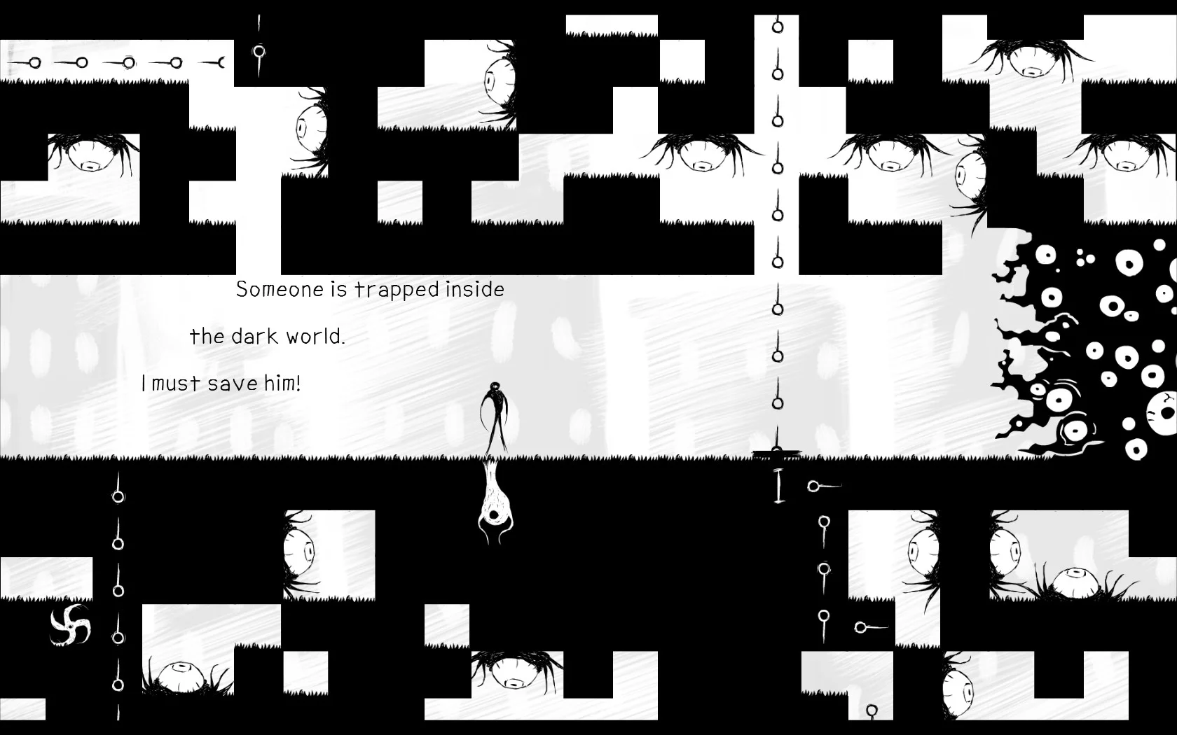 For those familiar with puzzle-platformers, there isn't much new here. You run through the level flipping switches and pressing buttons and evading enemies to find the exit to the level and escape. The light world/dark world mechanic comes with different dangers: Plants won't eat you if you're in the Dark World, you can walk right over saws in the light world, and so on and so forth.