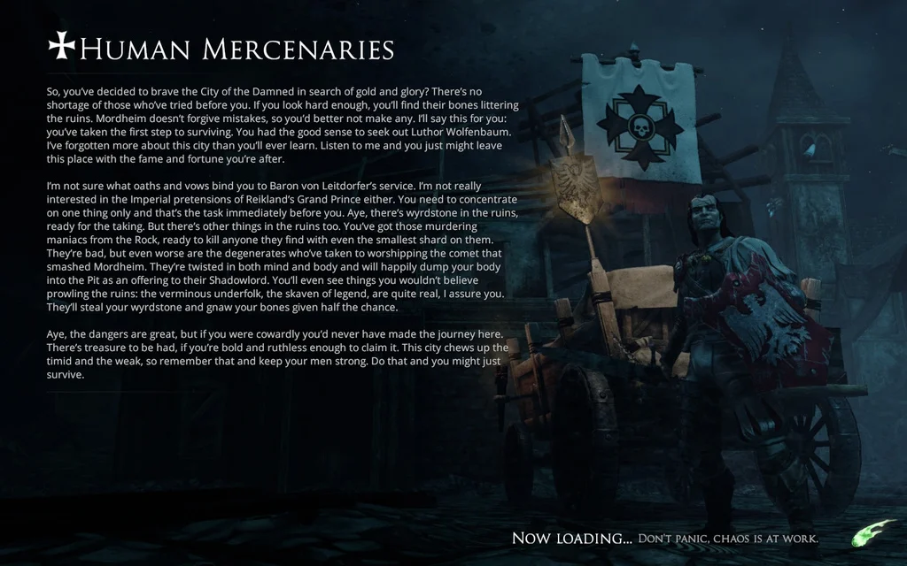 You play a band of these hunters from one of five factions: The Sisters of Sigmar, there to cleanse the city; the Church of the Pit, a Chaos-worshipping cult that formed around the comet's crater; human bounty hunters; the Skaven, rat-people driven above-ground by the city losing its grip on sanity; or Witch Hunters, driven to remove the supernatural influence from Mordheim and have a fun time doing so. The game is split into two sections, the "camp" screen, where you recruit and outfit your squad to take on missions, and the "mission" section, where you deploy into the city to do battle with other warbands and scavenge for goods. Each skirmish has an objective and a series of sub-objectives that you can complete if you so wish, strengthening your gang and your position in the city.